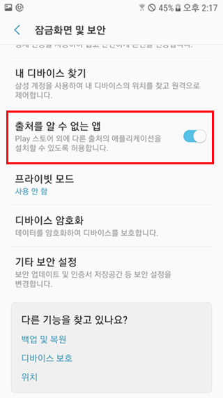 이 설정은 Play 스토어에서 다운을 받지 않는 경우 허용하는 것입니다.